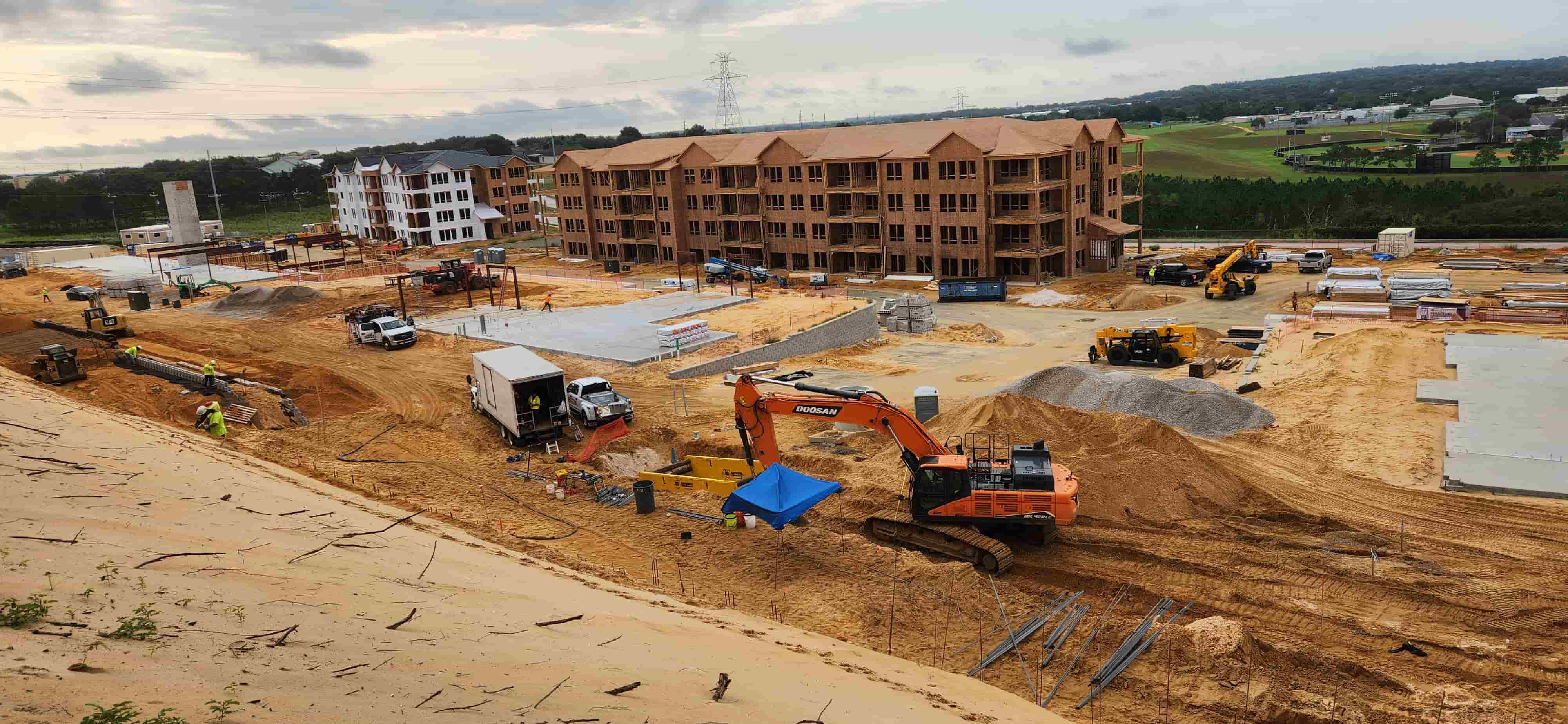 In Clermont, Florida, the construction of six 4-story apartment buildings faced significant soil stabilization challenges. Multiple retaining walls, designed by Paverscape, required a 25-foot cleared level area behind them. The site's topography and existing conditions made traditional methods like sheet piling impossible without risking damage to an existing retaining wall. The construction schedule was at risk due to these complications.